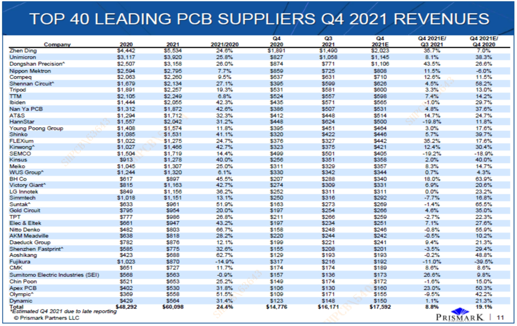 近期,国际知名电子行业咨询集团Prismark Partners发布2021年第四季度全球40强PCB企业排行榜与数据分析报告,共有七家内资企业上榜。其中,星空游戏科技在2021年第四季度全球PCB企业四十强排行榜中位列第22名,在内资PCB企业中位列第4名。